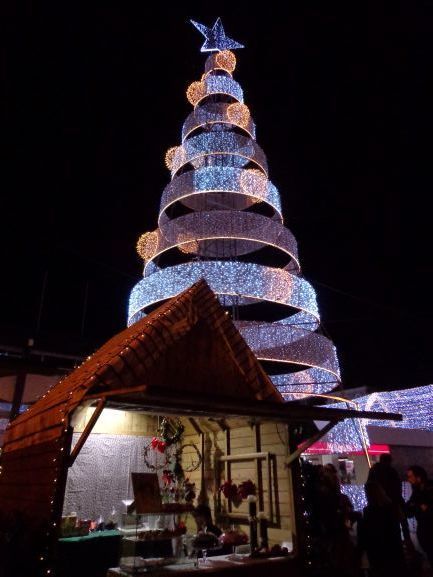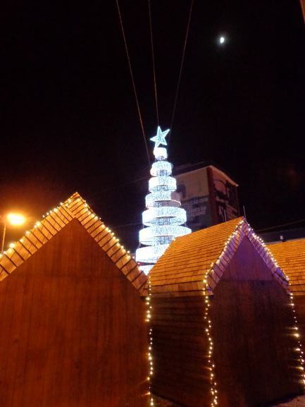 Malheureusement, probablement à cause de la pluie battante qu'on a eue toute la journée, le marché de Noël était fermé, nous avons donc fait le tour de la place en passant sous l'immense sapin lumineux