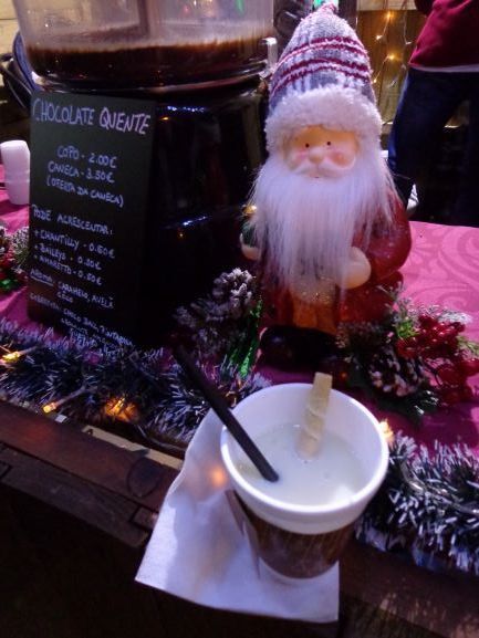 nous avons pu profiter des bons chocolats blancs chauds, des ginjinha (alcool de cerise) servies dans des verres en chocolat et du spectacle sans pluie cette fois !